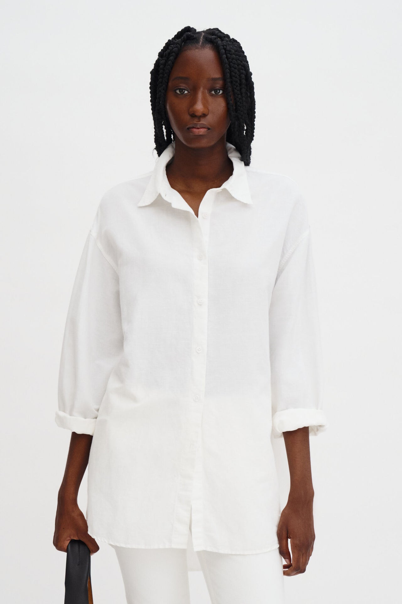 Sandie Linen Shirt on valmistettu pellavan ja luomupuuvillan sekoituksesta oversized-leikkauksella. Yksityiskohtina taitetut mansetit ja hienovarainen epäsymmetrinen alareuna.